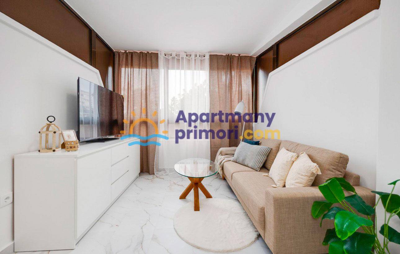 Apartmán sa nachádza priamo pri pláži a ponúka nádherný, ničím nerušený výhľad do záhrady a čiastočný výhľad na more. Jeho poloha je bezkonkurenčná – iba 50 metrov od mora, obklopený krásnymi plážami a zátokami, čo z tejto nehnuteľnosti robí ideálnu voľbu pre trvalé bývanie, druhý domov alebo investíciu. Apartmán sa nachádza na prízemí, avšak jeho vyvýšená poloha vytvára pocit prvého poschodia a poskytuje viac súkromia a prirodzeného svetla.