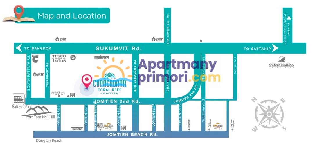 Copacabana Coral Reef Jomtien má ideálnu polohu na Jomtien 2nd Road, v blízkosti trhu Rompho. Táto vynikajúca poloha ponúka ľahký prístup k miestnym trhom, zábavným centrám a reštauráciám v pešej vzdialenosti. Vychutnajte si dokonalú kombináciu pokoja a pohodlia.